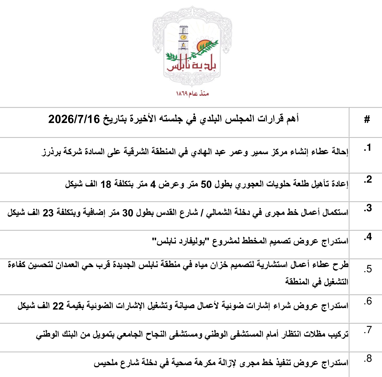 أهم قرارات المجلس البلدي في جلسته الأخيرة بتاريخ 16/7/2023