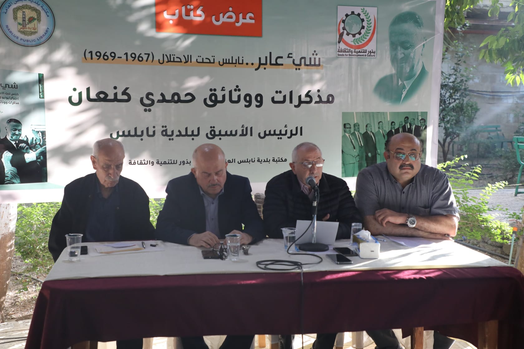 تحت رعاية بلدية نابلس، نظمت مكتبة بلدية نابلس العامة وجمعية بذور للتنمية والثقافة يوم أمس ندوة ثقافية لعرض كتاب "شيء عابر: نابلس تحت الاحتلال (حزيران/ يونيو 1967 - آذار/ مارس 1969): مذكّرات ووثائق حمدي طاهر كنعان"، للكاتب والباحث بلال شلش، يسرد فيه الأيام الأولى والحاسمة لأحداث حرب حزيران 1967، بتعليق وعرض الكاتب الأستاذ زهير الدبعي. وحضر هذه الندوة جمع مميز من المثقفين والأكاديميين والمهتمين، إضافة إلى معالي الدكتور سامي حجاوي، وزير الحكم المحلي.