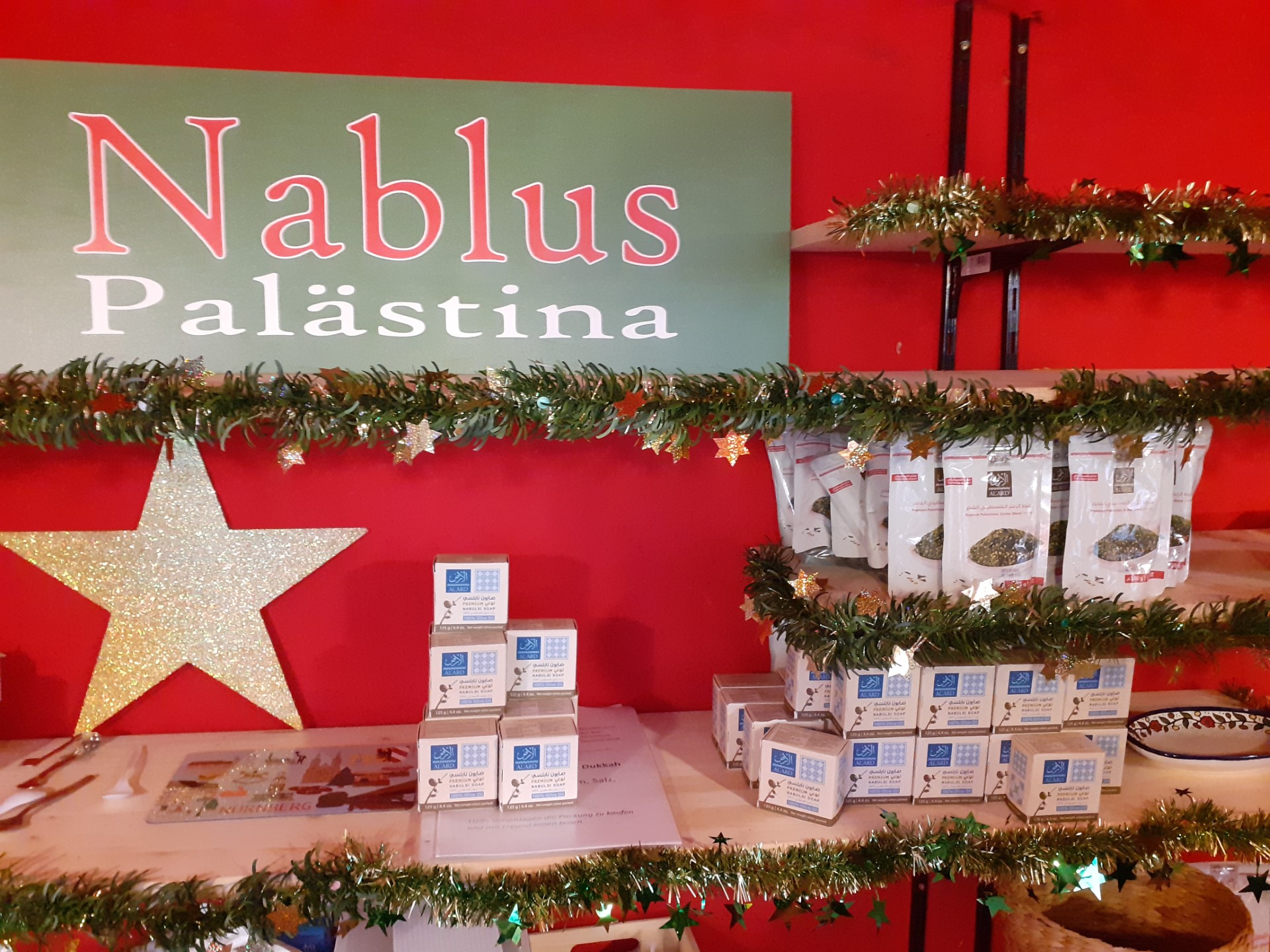 ويضم السوق زاوية خاصة لعرض وبيع العديد من المنتجات النابلسية والفلسطينية مثل المطرزات اليدوية والأغذية بمختلف انواعها، خاصة الحلويات والزعتر وزيت الزيتون، وصابون زيت الزيتون، وغيرها من المنتجات التي تقوم جمعية صداقة نابلس - نورمبيرج بتوريدها من نابلس وبيعها في الزاوية المخصصة لها في السوق.