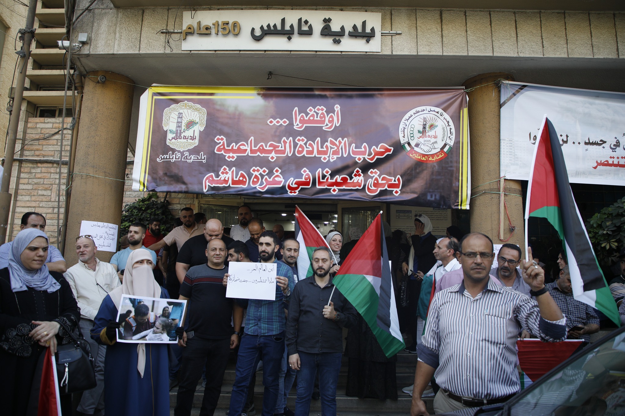 جانب من الوقفة الصامتة التي نظمتها نقابة العاملين في بلدية نابلس أمام مبنى البلدية يوم أمس، تضامنا مع أهلنا في قطاع غزة الحبيب، ورفضا للمجازر البشعة التي يرتكبها الاحت لال بحقهم.