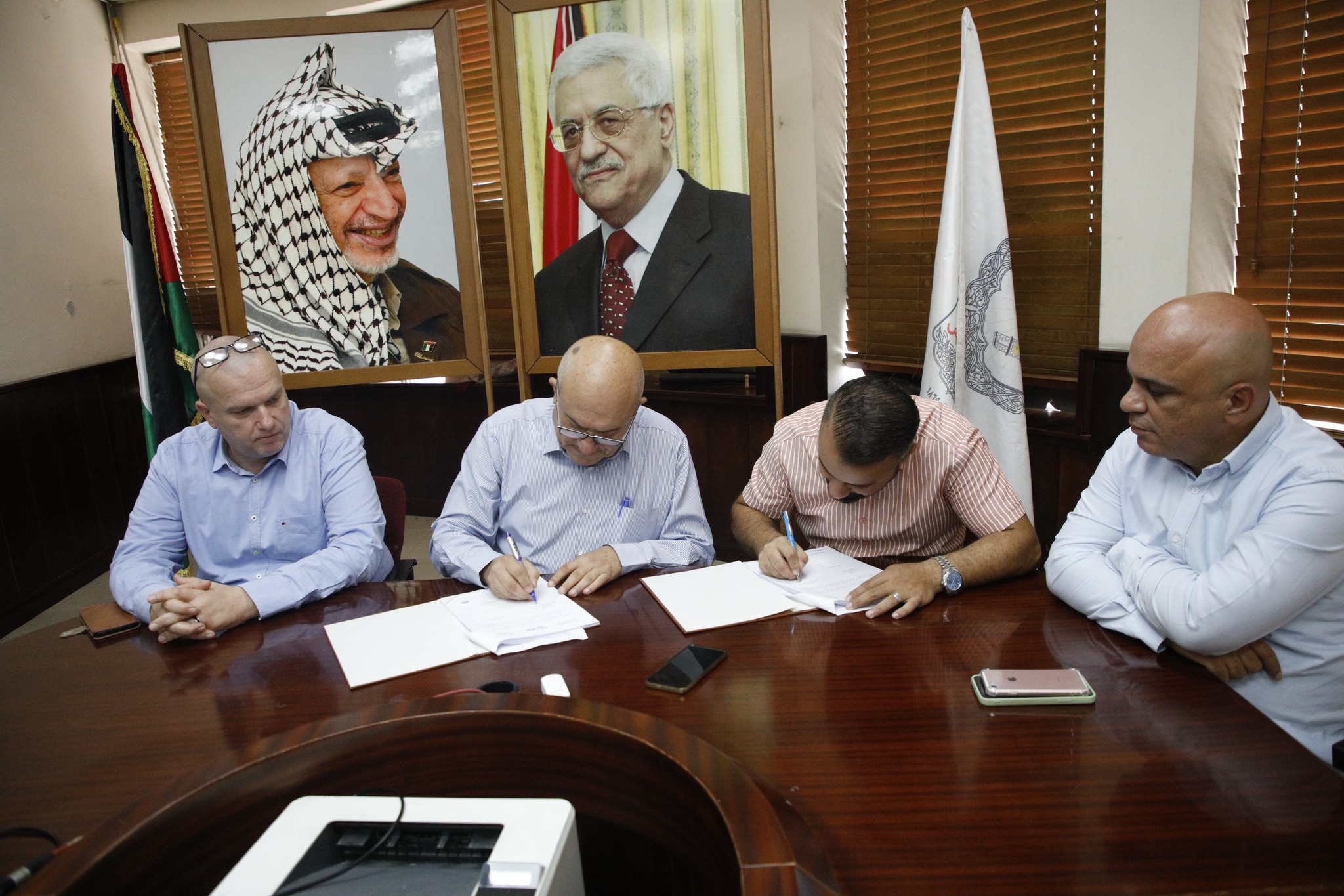 بالصور :- جانب من توقيع الدكتور سامي حجاوي رئيس بلدية نابلس مع ممثل شركة العماد للبناء والإعمار على اتفاقية عطاء تشطيب مدرسة عفاف العكر، وذلك بحضور مهندس بلدية نابلس سائد سالم ورئيس قسم العطاءات والمشتريات مجدي الاتيرة ، والاستاذ رائف العكر ممثلا عن العائلة.