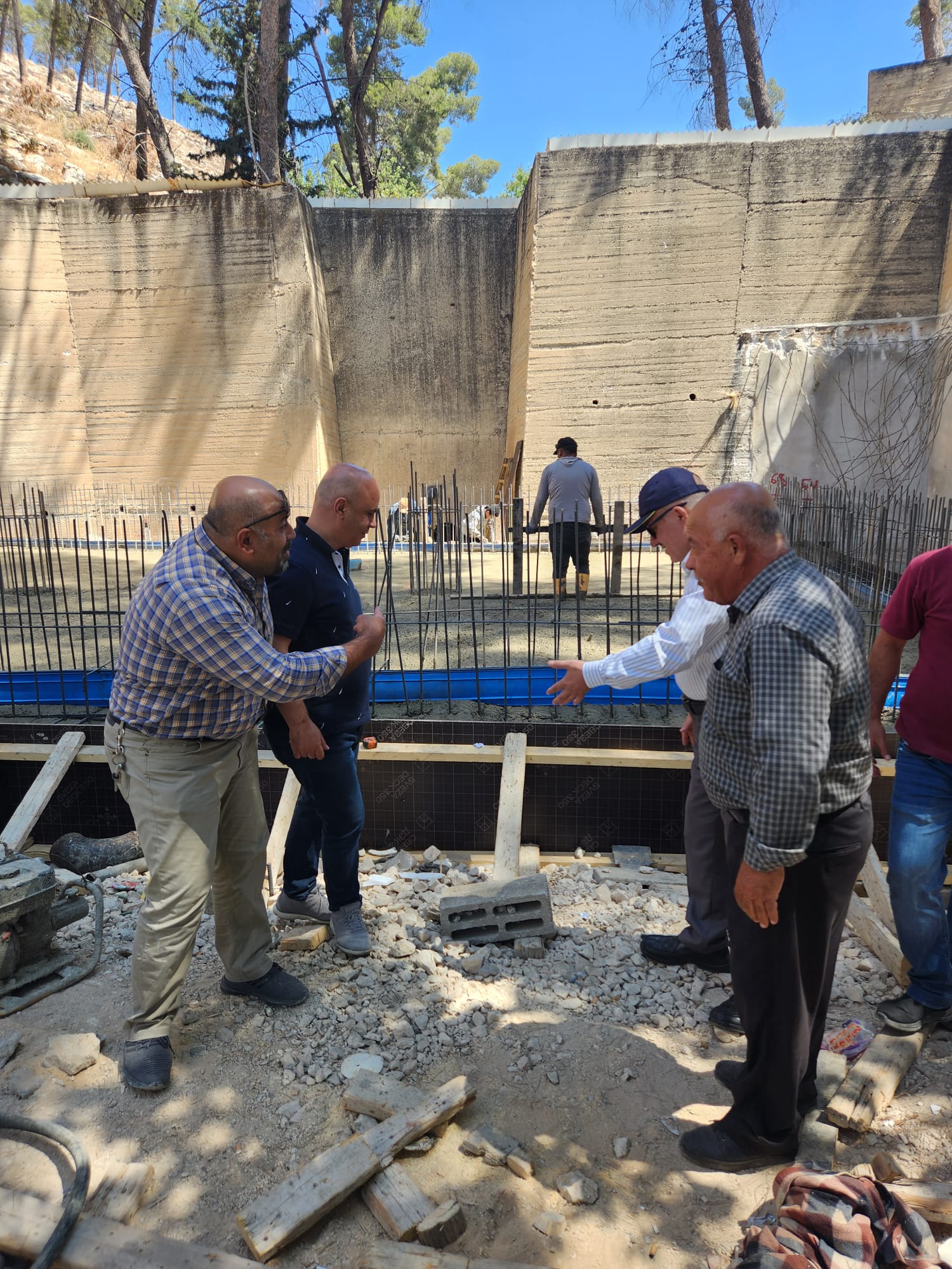 جانب من تفقد رئيس بلدية نابلس الدكتور سامي حجاوي ومدير الدائرة الهندسية المهندس سائد سالم صباح اليوم، سير الأعمال الإنشائية في مشروع خزان مياه البادان، بتمويل من صندوق البلدية وبتكلفة 850 الف شيكل.