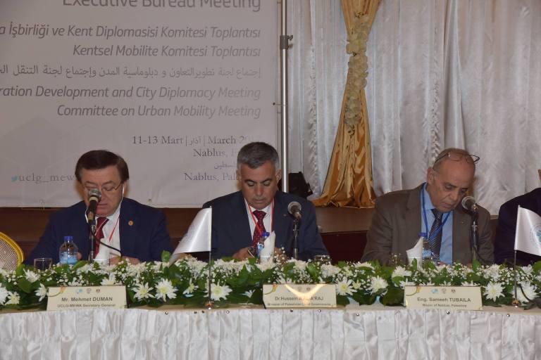 وافتتح الجلسة الافتتاحية للاجتماع رئيس لجنة بلدية نابلس وزير النقل والمواصلات المهندس سميح طبيلة ووزير الحكم المحلي الدكتور حسين الاعرج، ورئيس بلدية رام الله رئيس الاتحاد الفلسطيني للهيئات المحلية المهندس موسى حديد، والقنصل العام لتركيا في القدس حسنو غوركان ترك اوغلو، والامين العام لمنظمة UCLG-MEWA محمد دومان، وعارف امدجن المدير العام لشركة النقل في اسطنبول IETT رئيس لجنة التنقل الحضري بالمنظمة، وجيرتين غونغر الامين العام لاتحاد البلديات التركية رئيس لجنة التطوير والتعاون بالمنظمة.
