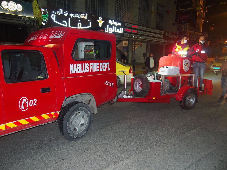 بالصور:- جهود متواصلة تبذلها طواقم واقسام بلدية نابلس بمتابعة رئيس البلدية وأعضاء لجنة ادارة الازمة في تعقيم مركز المدينة باستخدام مضخة آلية كبيرة، وذلك ضمن الاجراءات الاحترازية لمكافحة فايروس كورونا.