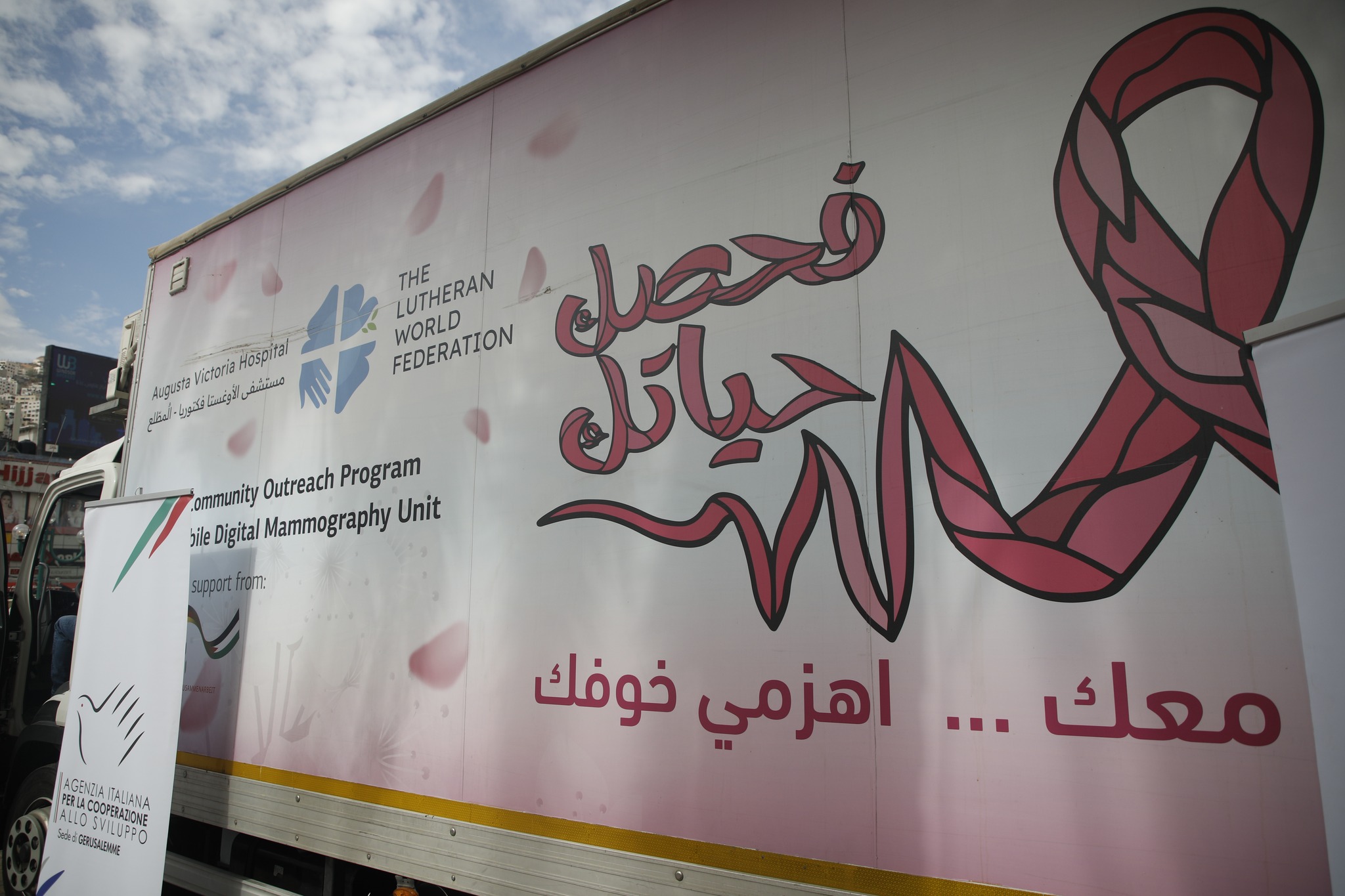 بمناسبة شهر أكتوبر الوردي، نظمت العيادة المتنقلة التابعة لمستشفى المطلع في القدس بالتعاون مع بلدية نابلس يوم أمس الأربعاء فعالية للكشف المبكر عن سرطان الثدي من خلال إجراء الفحوصات السريرية والفحص الاشعاعي (تصويرالماموجرام).