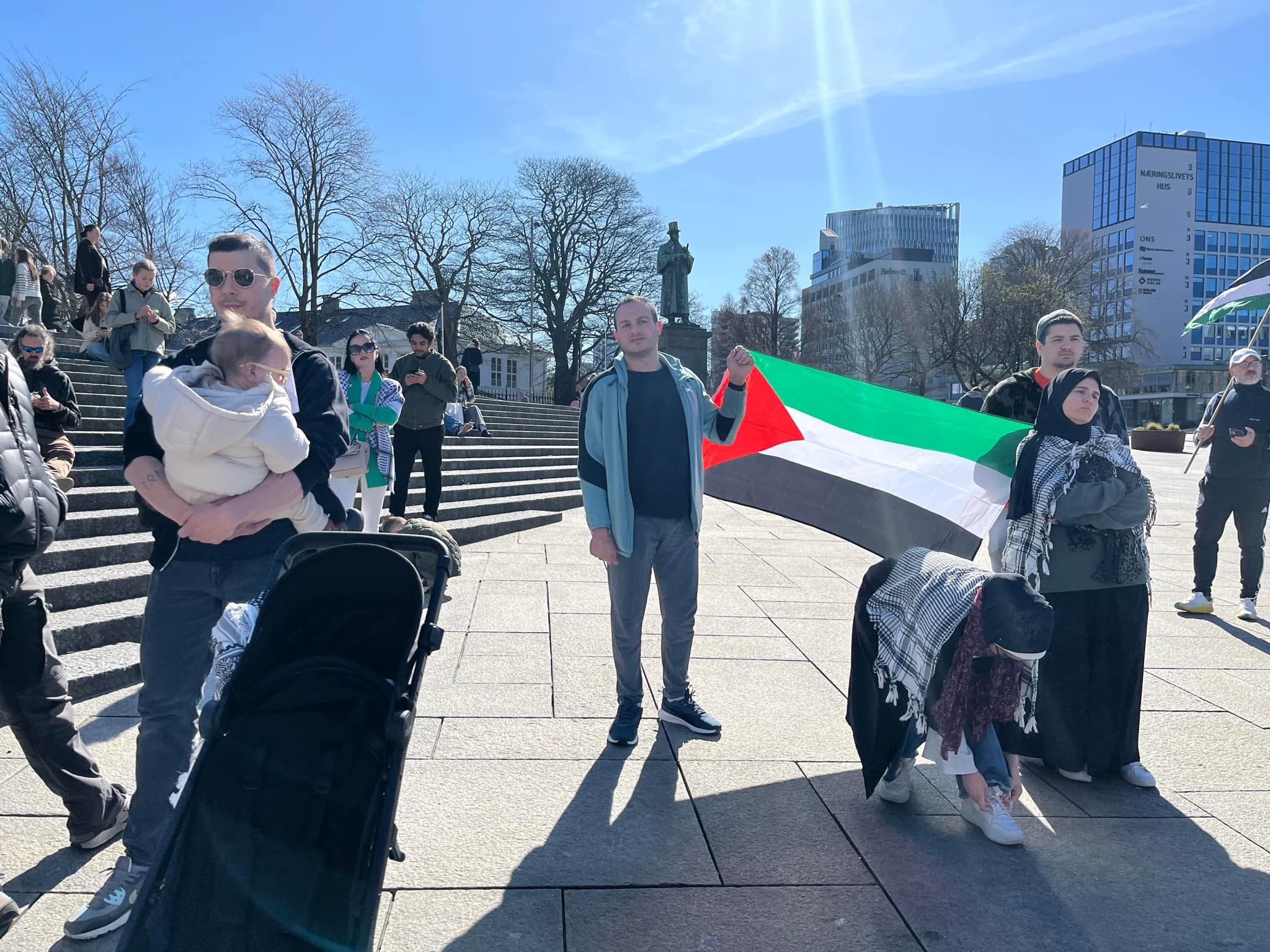 من وسط مدينة ستافنجر النرويجية حيث نظم ناشطون من المدينة التي تربطها بنابلس علاقات توأمة وقفة احتجاجا على العدوان المستمر على أهلنا في غ ز ة.