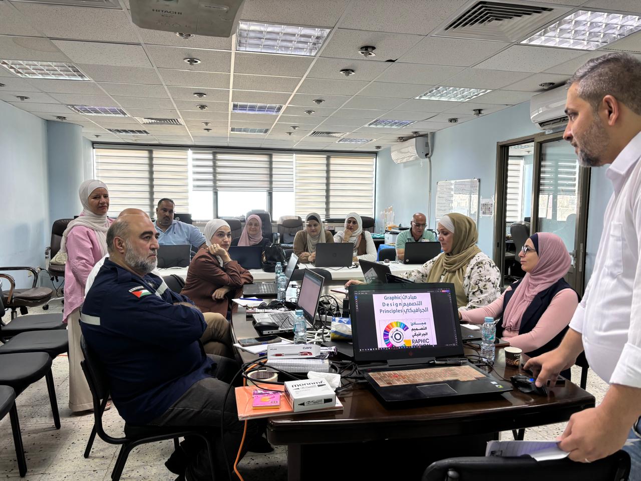 جانب من الورشة التدريبية الخامسة ضمن مجموعة من التدريبات لبلديات شمال الضفة الغربية (نابلس- طولكرم –طوباس –جنين). تحت عنوان "التصميم الجرافيكي" وتضمنت عدة محاور أهمها مبادئ التصميم الجرافيكي وتطبيقها في العمل البلدي وتهدف إلى رفع كفاءات العاملين في البلديات المستهدفة، والتي تنفذها بلدية نابلس من خلال وحدة التخطيط الاستراتيجي والتنمية الاقتصادية التابعة لها بتمويل من مؤسسة اوربت الدولية للتدريب المهني ، وقد عقد التدريب لمدة يومين بحضور 14 مشارك، وقدمه المدرب ضياء موسى.